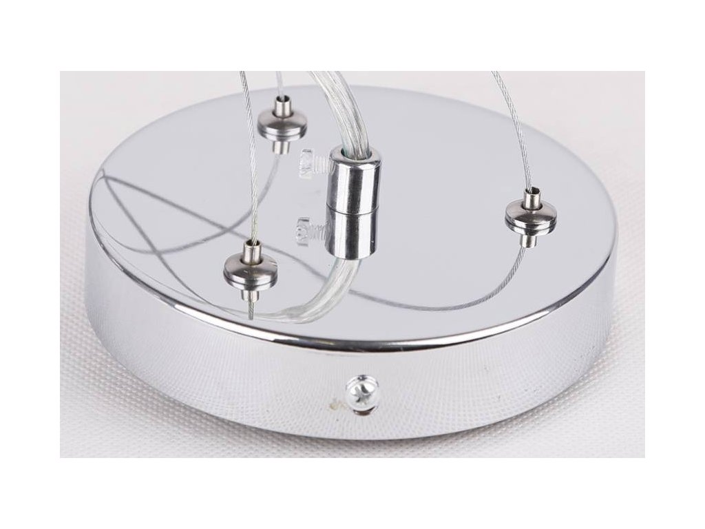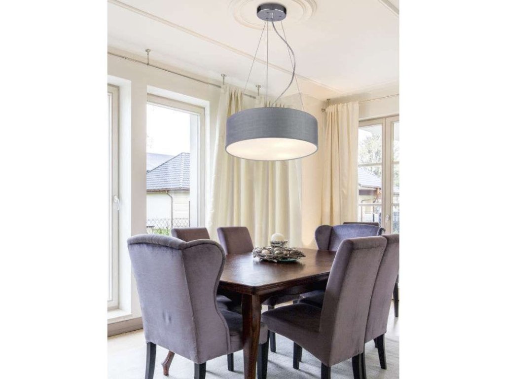 Závesný LED luster s päticami 3x E27 s výkonom max. 40W. Rozmer tohto svietidla je ø400x1000mm. Jedná sa o svietidlo, ktoré sa svojim dizajnom hodí do klasického aj škandinávskeho interiéru. Vytvorí jedinečnú atmosféru v obývacej izbe alebo spálni. Tienidlo je pripevnené ku chrómovej základni tromi kovovými článkami s mechanizmom nastavenia výšky. Tienidlo šedej farby je vyrobené z dvoch vrstiev, kde vnútornú časť tvorí plast a vonkajšia látka. Spodná časť tienidla je opatrená mliečnym krytom priepustným pre svetlo.