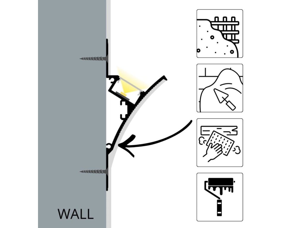 Profil je navrhnutý pre zapustenú montáž do SDK konštrukcií, kde je určený na úplné začlenenie do povrchu steny alebo stropu. Najskôr sa mechanicky upevní, čím sa zabezpečí presné osadenie a stabilná inštalácia. Následne sa profil vystuží sieťkou a zatmelí tak, aby vznikol plynulý prechod medzi profilom a okolitým povrchom. Po vytvrdnutí sa povrch prebrúsi do hladkého finálneho stavu a v záverečnom kroku sa natrie tak, aby profil vizuálne splýval s okolnou plochou. Výsledkom je čisté architektonické riešenie, pri ktorom zostáva viditeľný iba jemný efekt nepriameho osvetlenia.