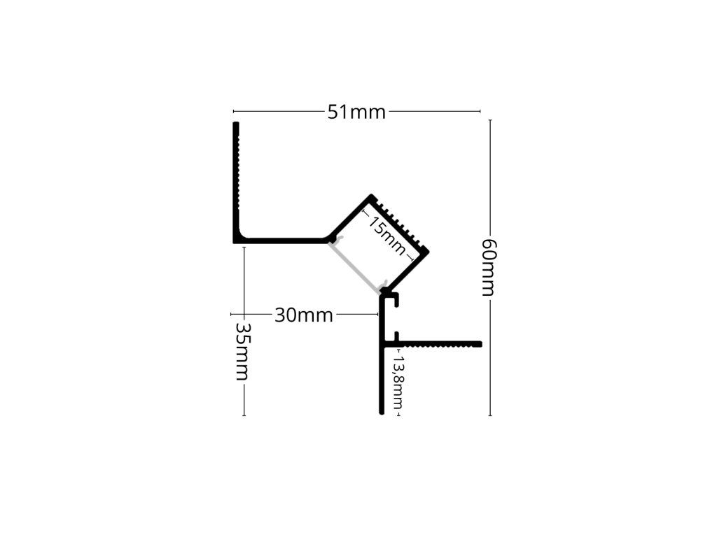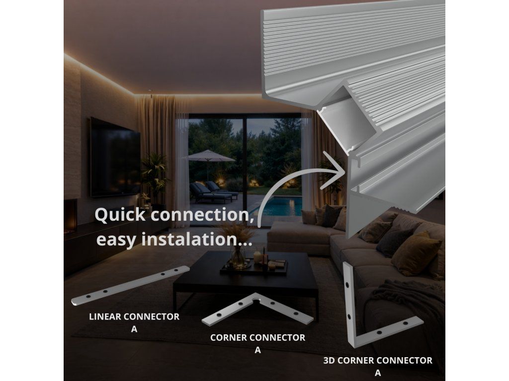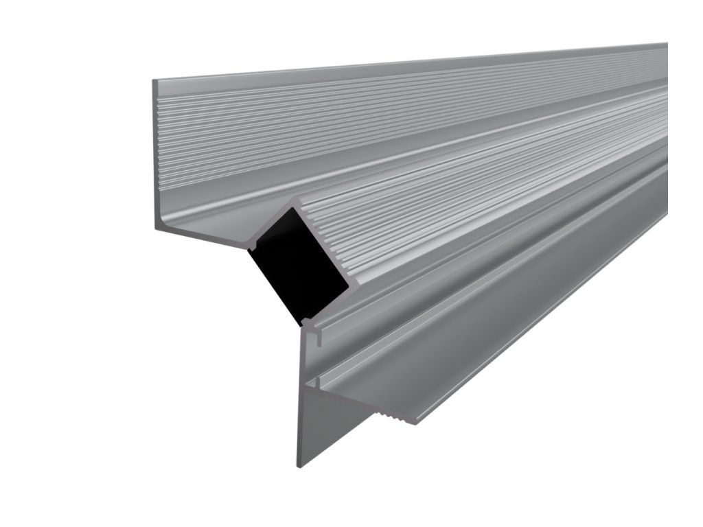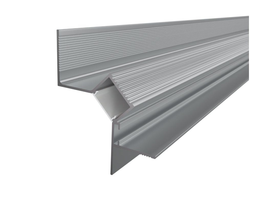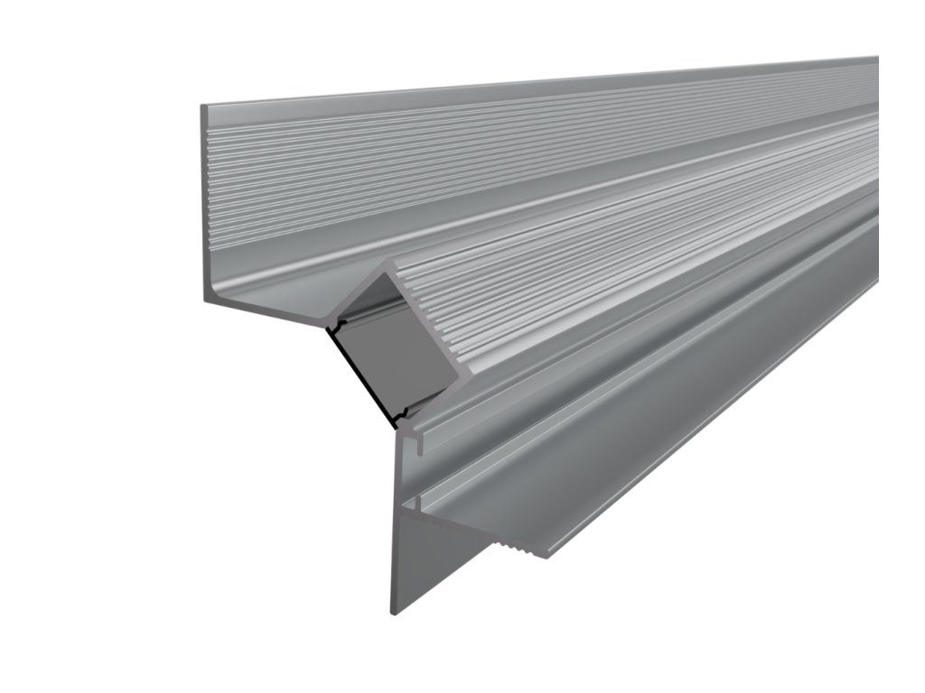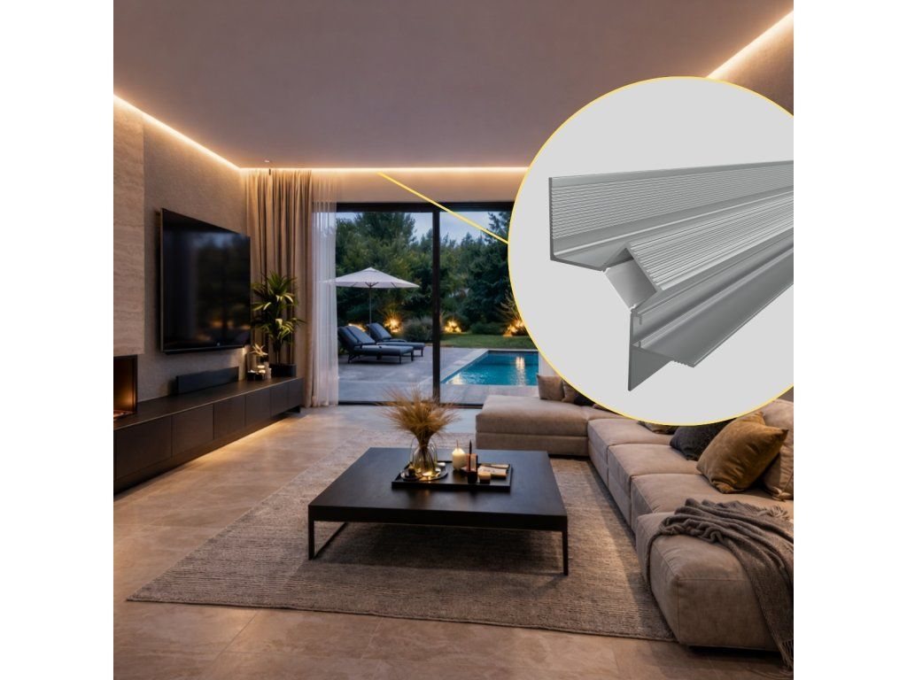 Vstavaný hliníkový profil do sadrokartónu slúži ako účinný chladič pre LED pásik a zároveň ako nenápadný architektonický prvok, ktorý umožňuje vytvoriť čisté a súvislé línie osvetlenia. Vďaka konštrukcii s umiestnením LED pásika pod uhlom 45° smeruje svetlo na stenu, čím vytvára jemné, rovnomerné nasvietenie bez viditeľného zdroja svetla. Po inštalácii je profil integrovaný do konštrukcie stropu v nadväznosti na stenu, takže v interiéri zostáva viditeľný iba svetelný efekt. Výsledkom je čistá svetelná línia po obvode priestoru, ktorá pôsobí nenápadne a zároveň zvýrazňuje štruktúru povrchov.