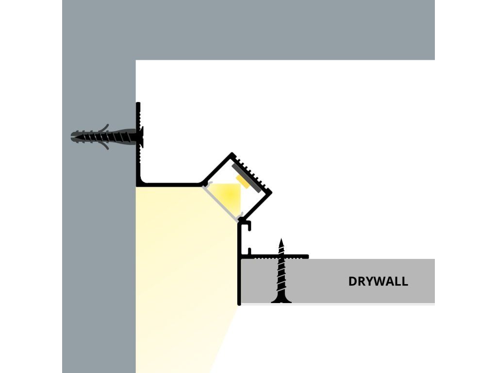 Profil je navrhnutý pre zapustenú montáž do SDK konštrukcií v mieste napojenia stropu a steny. Upevňuje sa k stene pomocou hmoždiniek a následne sa výškovo zarovná s konštrukciou sadrokartónového podhľadu. SDK dosky sa potom skrutkujú priamo na profil, čím vznikne súvislá rovina stropu s integrovaným priestorom pre LED pásik. Profil umožňuje napájanie jednotlivých dielov do súvislých línií aj rohov, takže je vhodný aj pre rozsiahlejšie inštalácie.