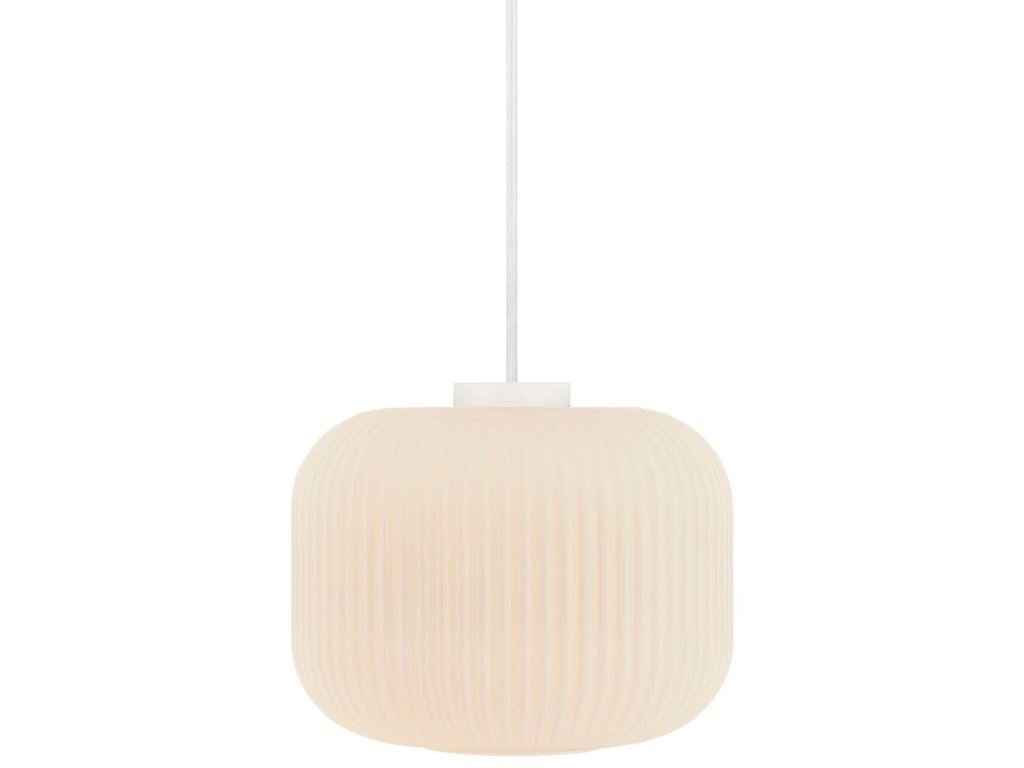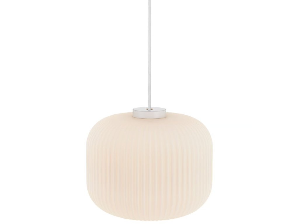 Závesný luster Milford vyniká elegantným tienidlom z opálovo bieleho, ručne fúkaného skla, ktorého jemne ryhovaný povrch dodáva svietidlu výnimočný charakter. Organický tvar v kombinácii s polotransparentnou štruktúrou zaisťuje mäkké, rovnomerné osvetlenie, ktoré vytvára príjemnú a útulnú atmosféru v interiéri.