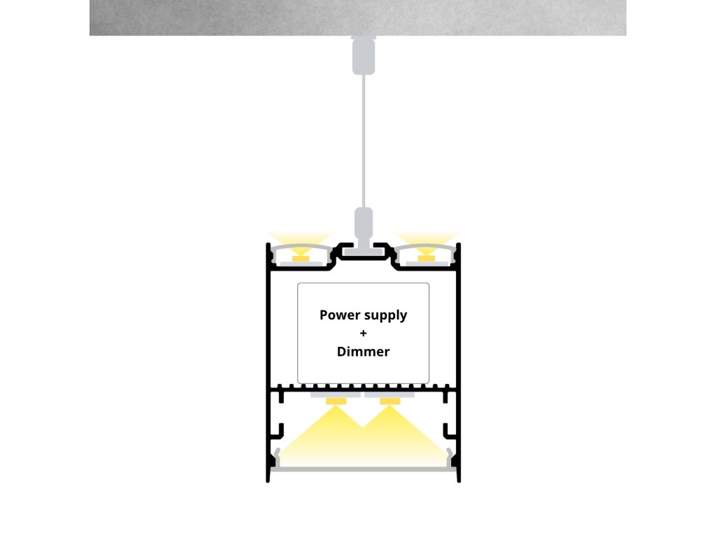 Tento závesný hliníkový profil je univerzálnym riešením pre moderné interiéry. Možno ho použiť na zavesenú, prisadenú aj sadrokartónovú montáž a ponúka kombináciu priameho aj nepriameho svietenia. Vďaka priestrannej dutine umožňuje ukryť napájací zdroj aj stmievač priamo do profilu, čo zaisťuje čistú a minimalistickú inštaláciu.