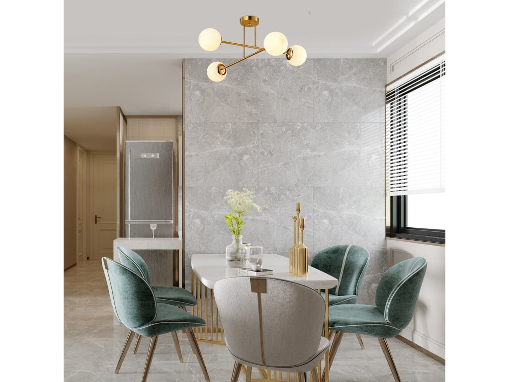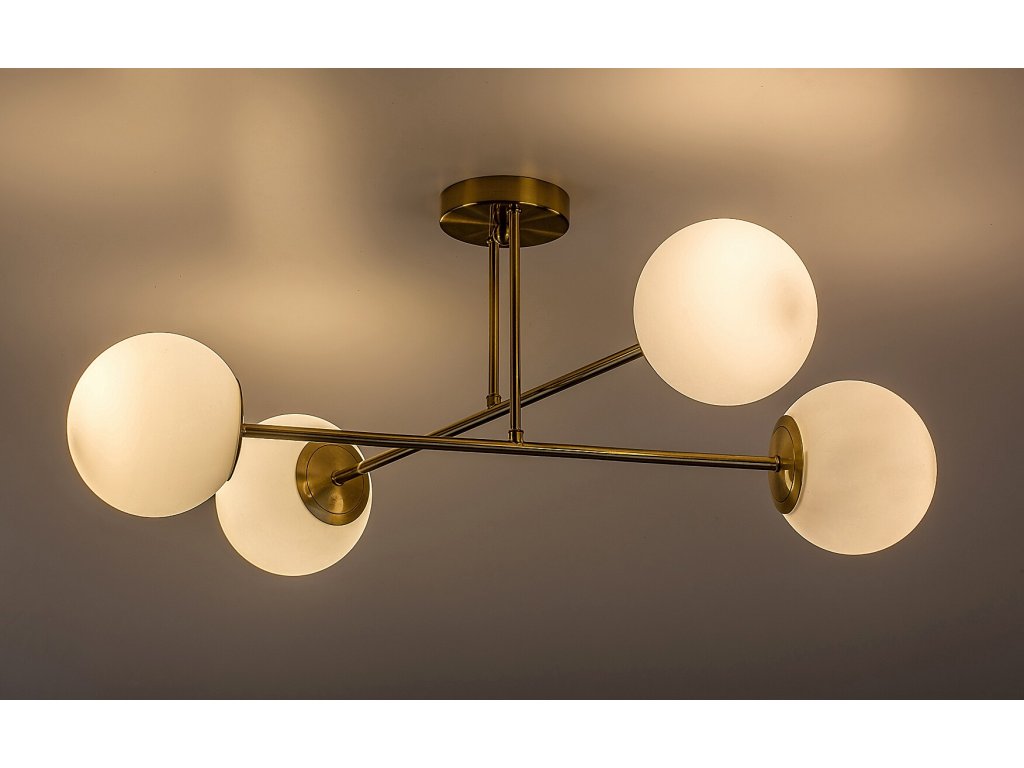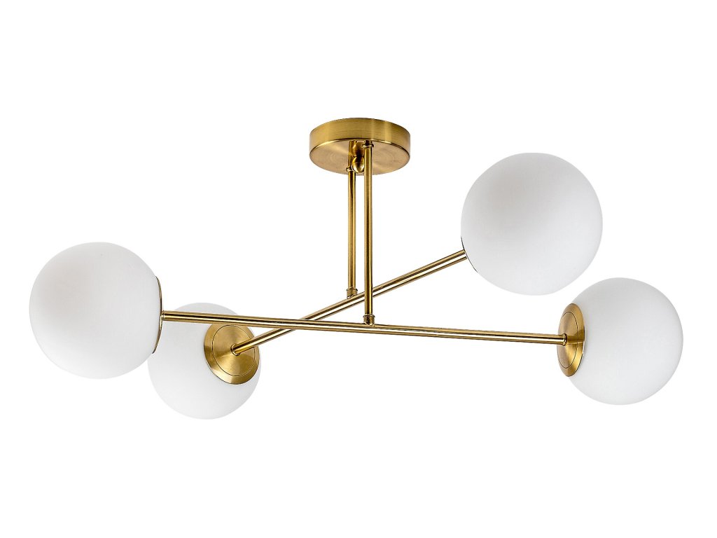 Závesné stropné svietidlo Kiara prináša modernú eleganciu do každého interiéru. Jeho kovová konštrukcia v zlatom odtieni doplnená štyrmi okrúhlymi tienidlami z bieleho skla vytvára harmonickú kombináciu klasického a súčasného štýlu.