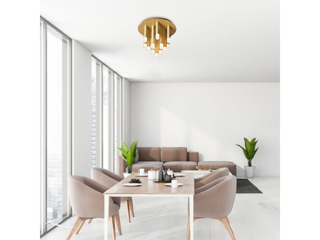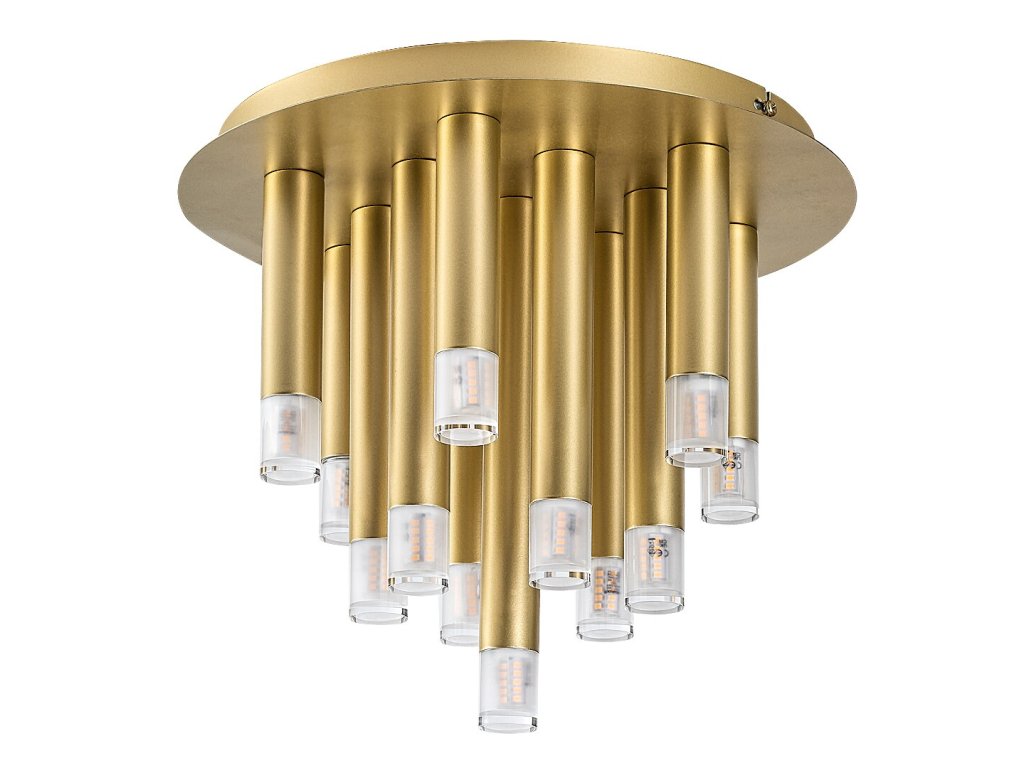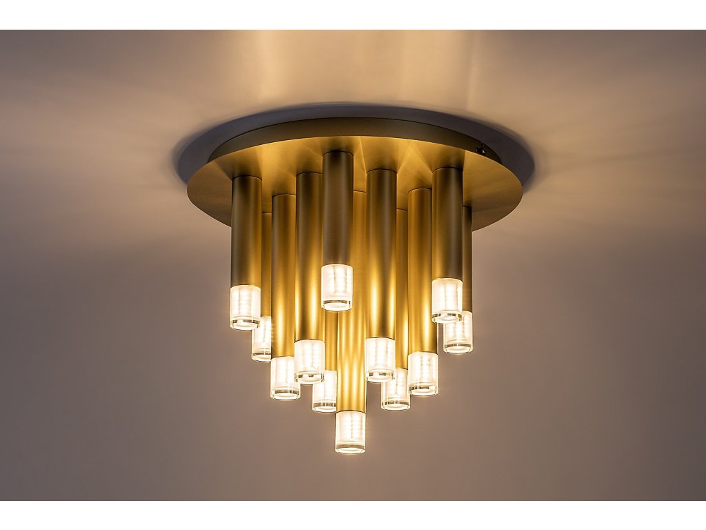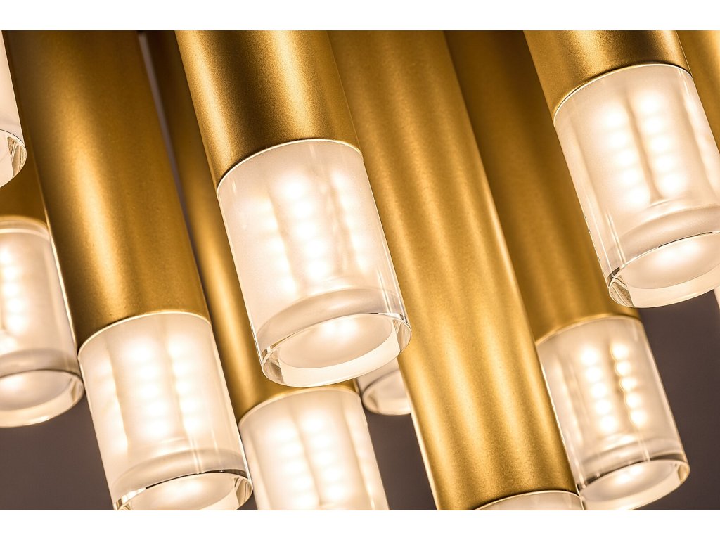 Stropné svietidlo Ramira zaujme výrazným moderným dizajnom, ktorý sa stane neprehliadnuteľným prvkom interiéru a zároveň poskytne dostatok svetla aj vo väčších miestnostiach. Konštrukcia z lakovaného kovu v elegantnej zlatej farbe je doplnená sústavou valcových svetelných prvkov rôznych dĺžok, ktorých usporiadanie pripomína cencúle alebo visiace stalaktity. Tento dynamický tvar dodáva svietidlu originálny, takmer sochársky charakter, ktorý v priestore pôsobí elegantne a zároveň veľmi efektně.