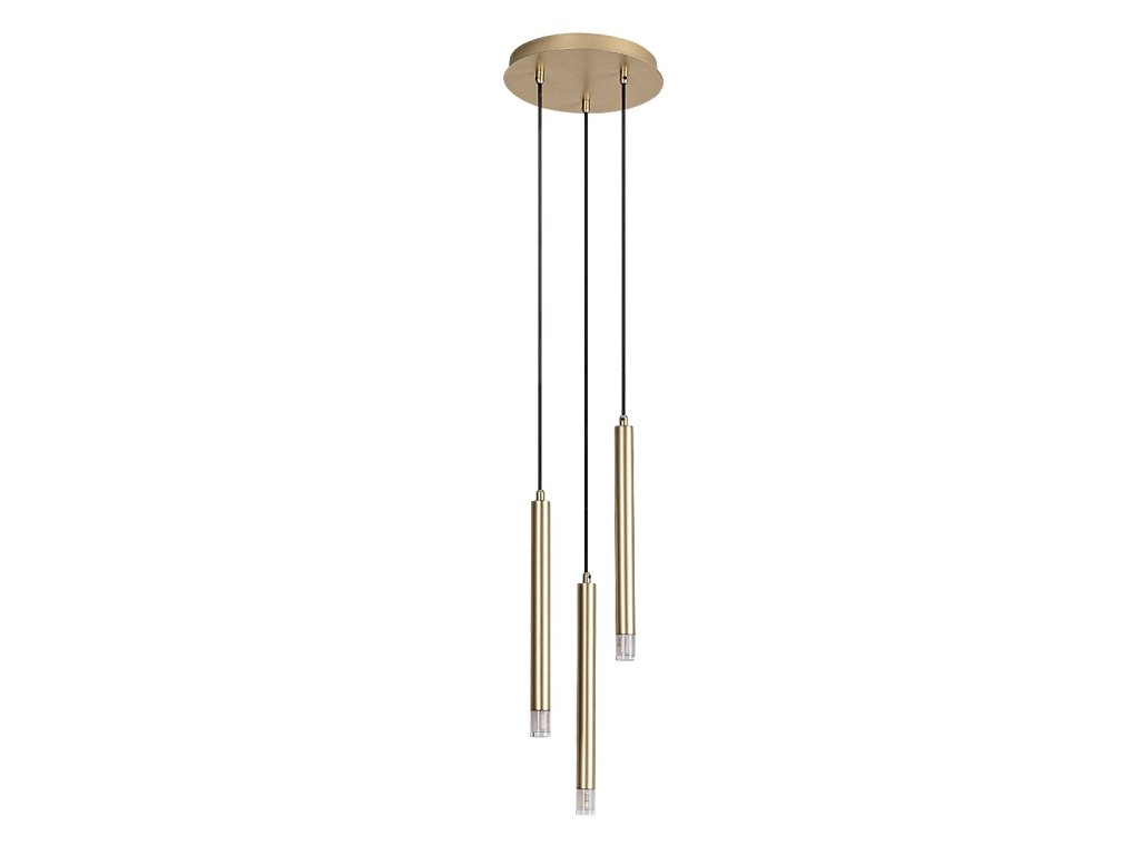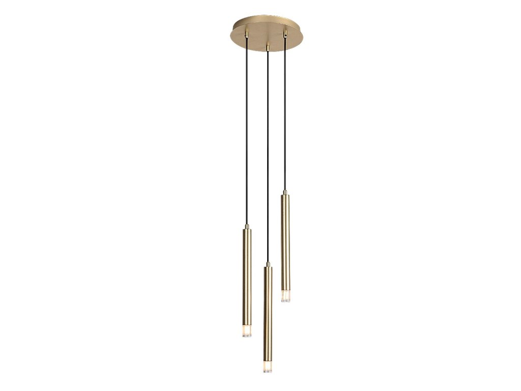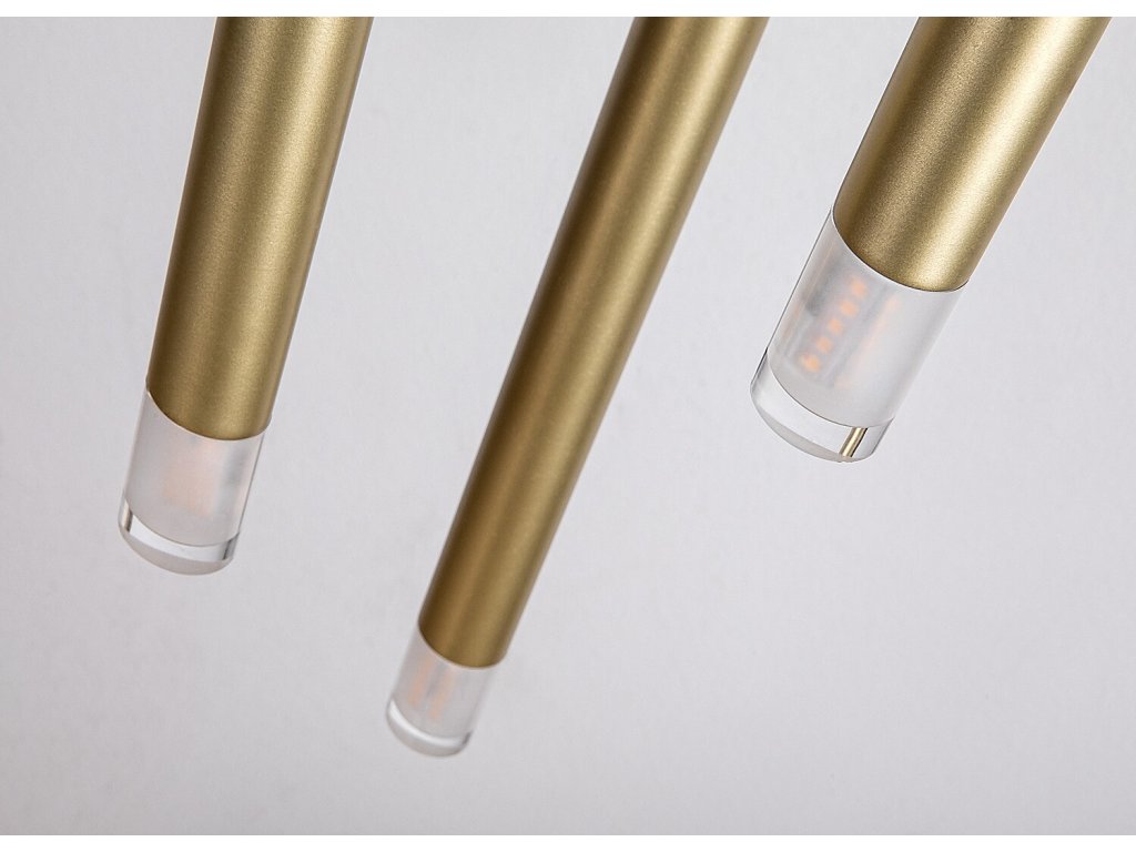 Jednotlivé svetelné prvky majú trubicový, valcový tvar a sú vyrobené z kovu v zlatej farbe. Každý z nich je zakončený priehľadným akrylovým tienidlom, ktoré zabezpečuje priame a koncentrované vyžarovanie svetla smerom nadol. Vďaka rozdielnym dĺžkam závesov vzniká zaujímavá priestorová kompozícia, ktorá je ideálna napríklad nad jedálenský stôl, kuchynský ostrovček alebo ako dizajnový prvok v obytnom priestore či spálni.