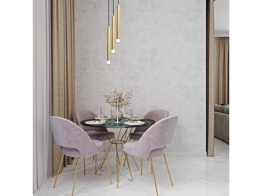 Závesné svietidlo Ramira v zlatom vyhotovení zaujme minimalistickým dizajnom a elegantným usporiadaním troch štíhlych svetelných prvkov, ktoré sú zavesené v rôznych výškach. Táto kompozícia vytvára dynamický, no pritom veľmi čistý vizuálny dojem, vďaka ktorému sa svietidlo stáva výrazným dekoratívnym prvkom moderného interiéru. Zlatý kovový povrch dodáva svietidlu teplejší a luxusnejší charakter, ktorý v priestore pôsobí reprezentatívne, bez toho aby bol dominantný.